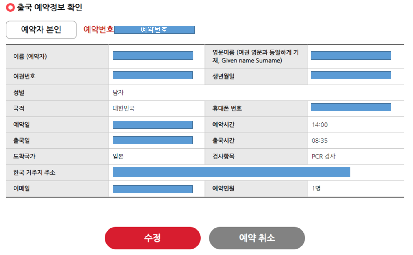 이후, 국적, 휴대폰 번호, 예약일, 예약시간, 출국일, 출국시간, 도착국가 등 필수 항목을 넣어주고