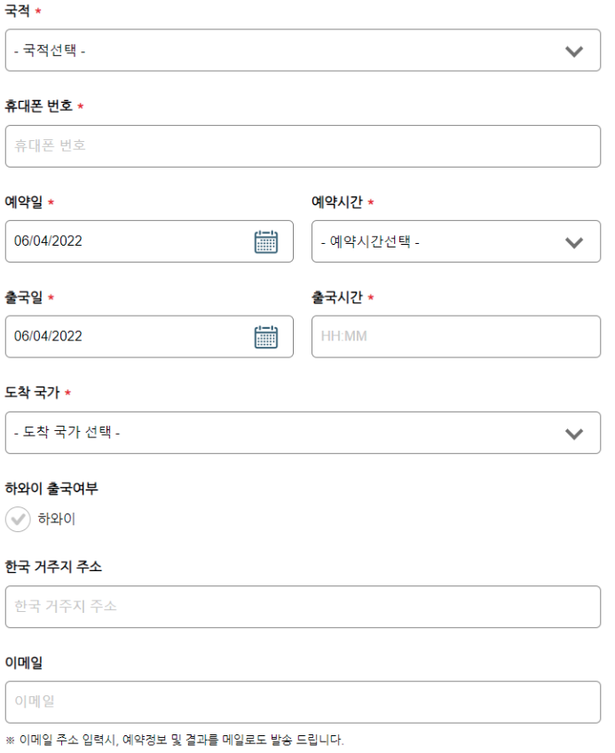 이후, 국적, 휴대폰 번호, 예약일, 예약시간, 출국일, 출국시간, 도착국가 등 필수 항목을 넣어주고