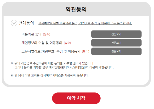 우선 검사 예약을 누르자마자 약관 동의를 해야 진행할 수 있다.