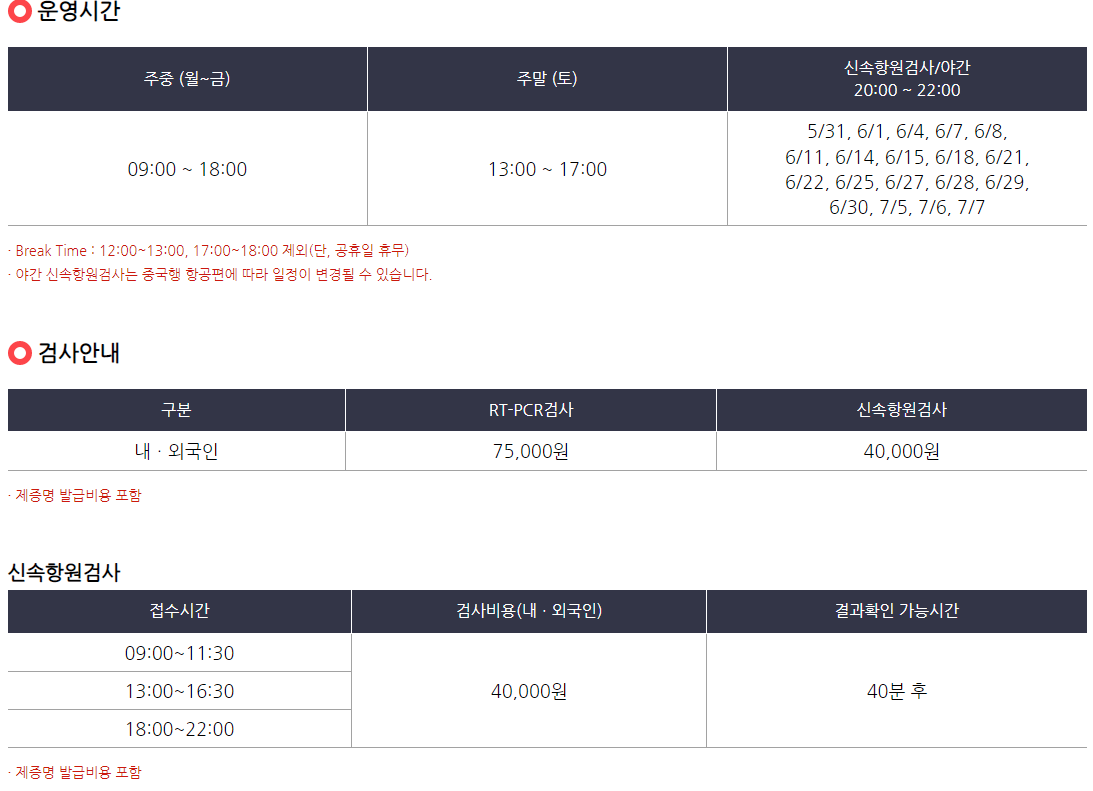 검사 비용과 운영 시간, 결과 확인 가능시간
