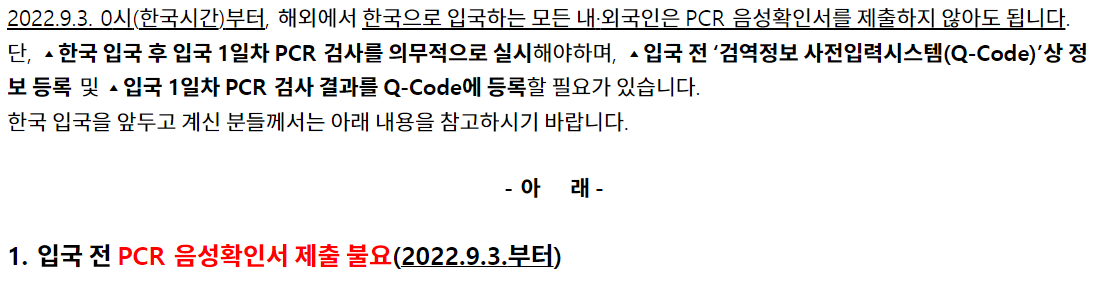 "입국전 PCR 음성확인서 제출 불요(2022.9.3부터)"