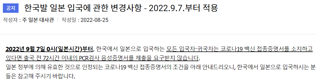 2022년 9월 7일 0시(일본시간)부터, 한국에서 일본으로 입국하는 모든 입국자·귀국자는 코로나19 백신 접종증명서를 소지하고 있다면 출국 전 72시간 이내의 PCR 검사 음성증명서를 제출을 요구받지 않습니다.
