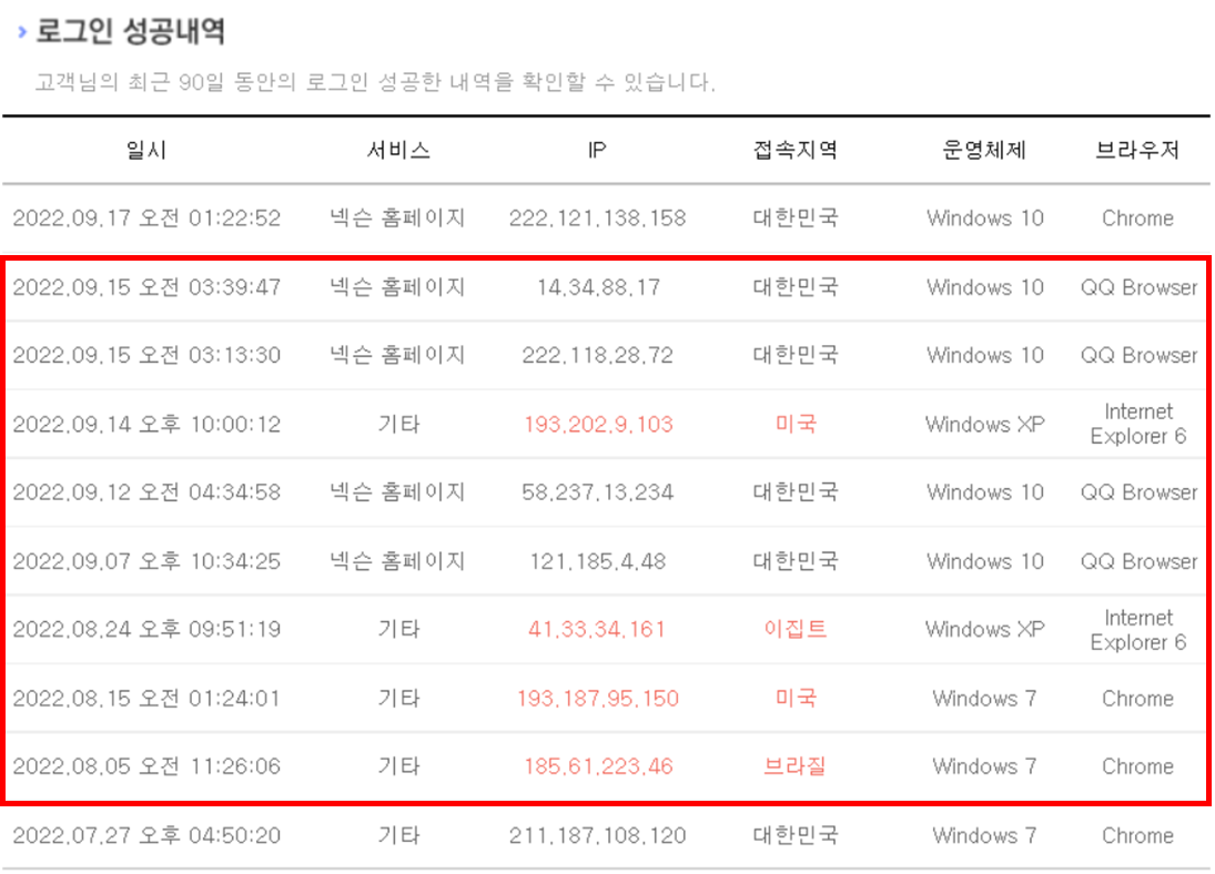 접속지역이 대한민국에도 존재했으니 해외 로그인 차단만으로는 부족하다.