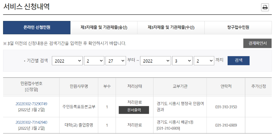 "Home > MY GOV > 나의 서비스 > 서비스신청내역"으로 들어가 해당 신청내역을 확인하고