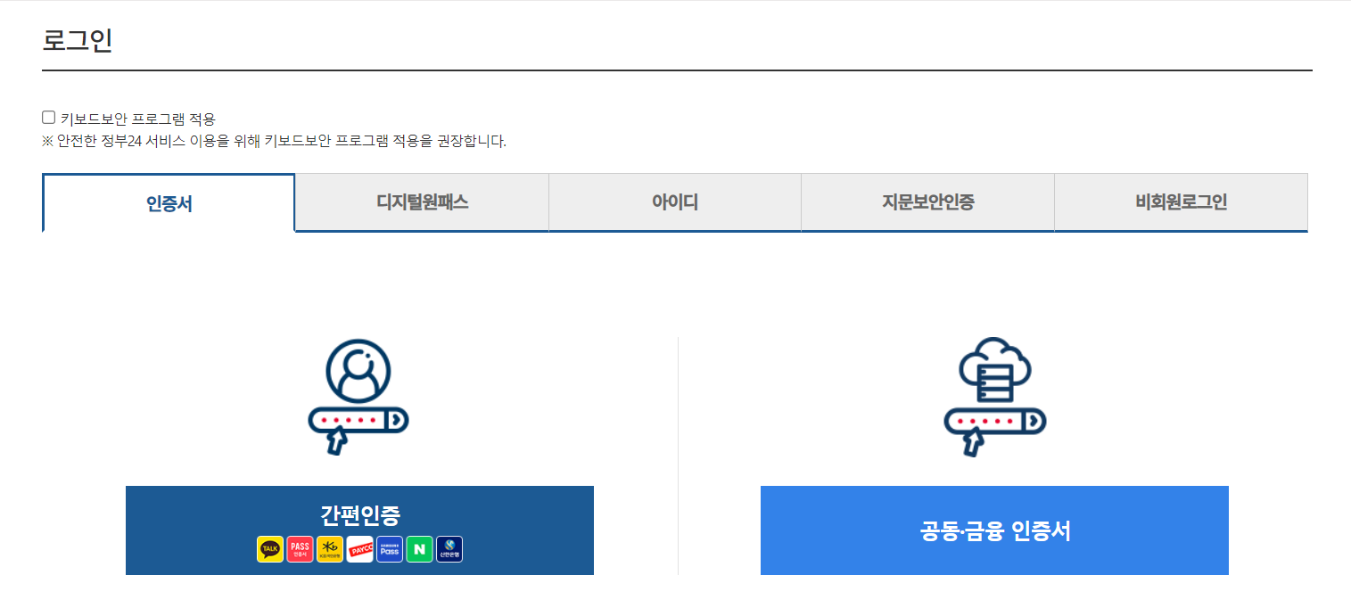 여기서 발급을 눌러주면 작은 로그인 창이 나오고 여러가지 로그인 방법중 한가지 방법으로 로그인 해야합니다.