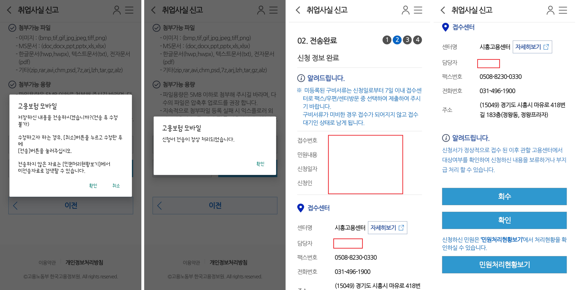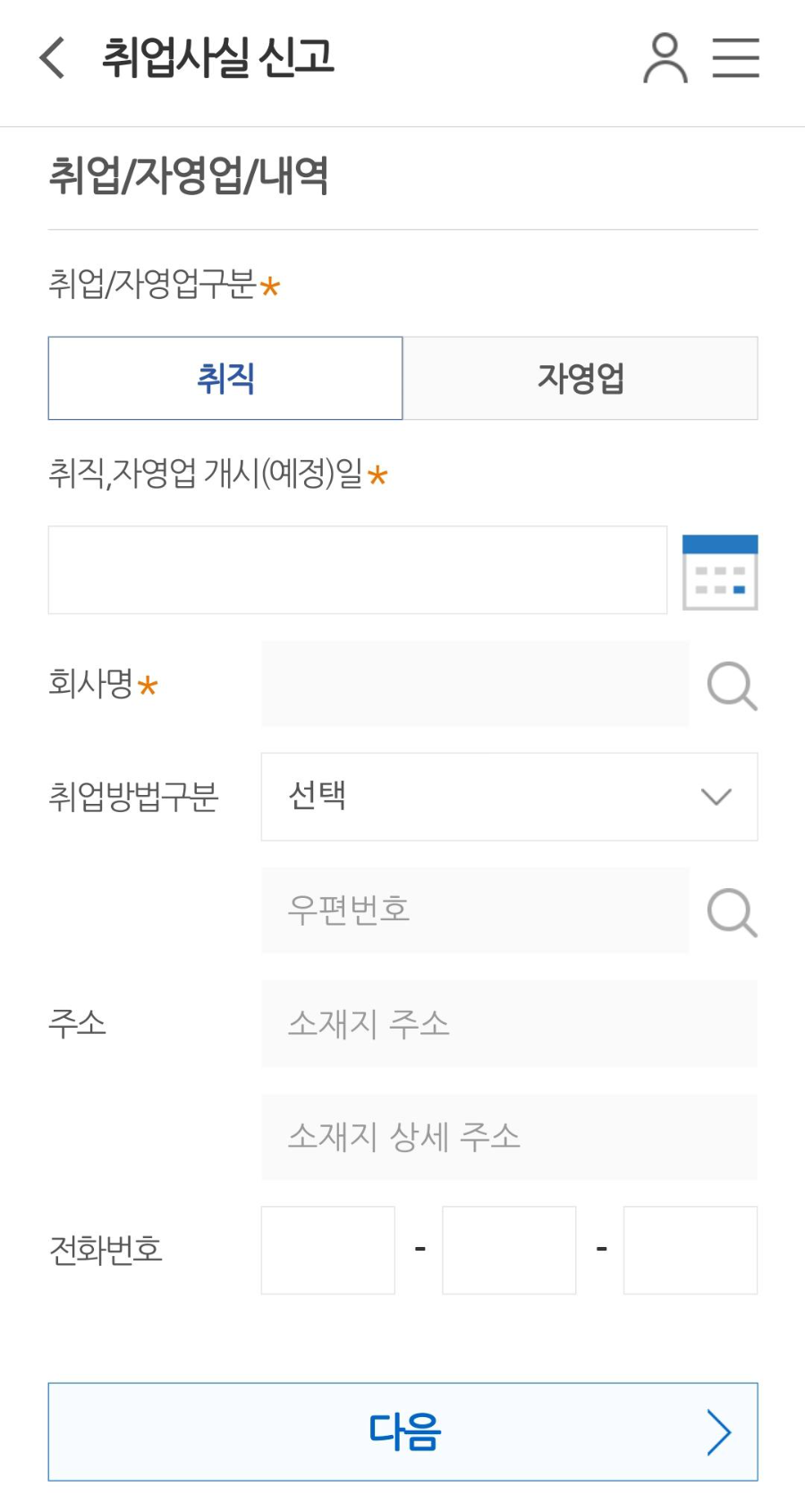 첫화면에서는 취업사실 신고 화면이 나오지 않는다.