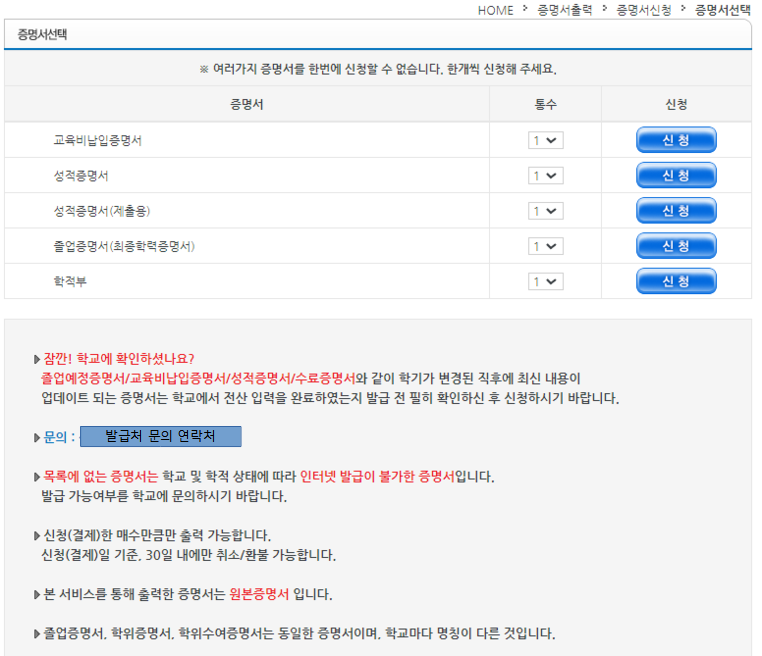 안내에는 한가지 증명서씩 신청해야 한다고 하네요