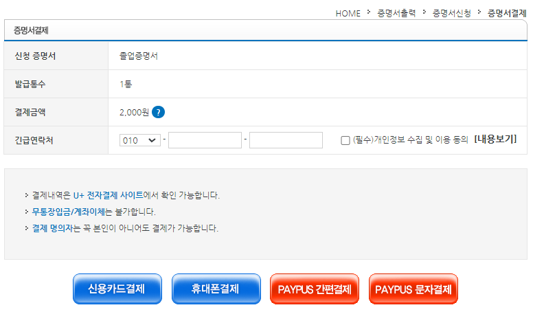 졸업증명서를 출력해보면 2,000원의 비용과 함께 출력이 가능하다고 합니다.