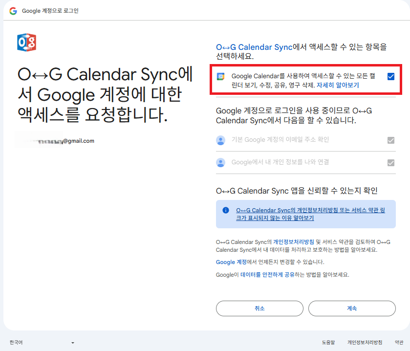 구글에 액세스 할 캘린더를 설정해서 동기화시킨다. 동기화 방향 및 기존항목과 중복 시에 삭제할지 병합할지를 선택할 수 있고