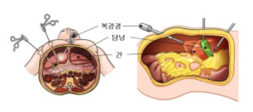 - 배에 3-4개의 작은 구멍을 뚫고 카메라와 기구를 삽입해 수술합니다.