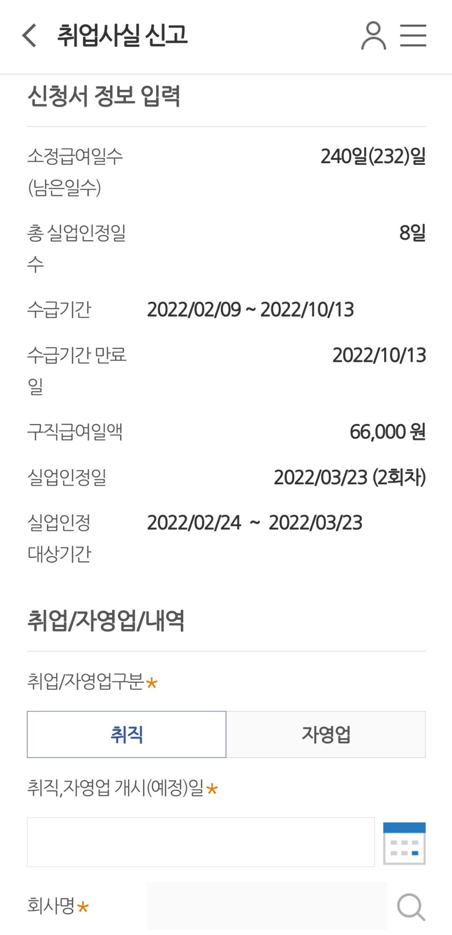하단부터는 본격적으로 재취업 내역을 입력해야한다.