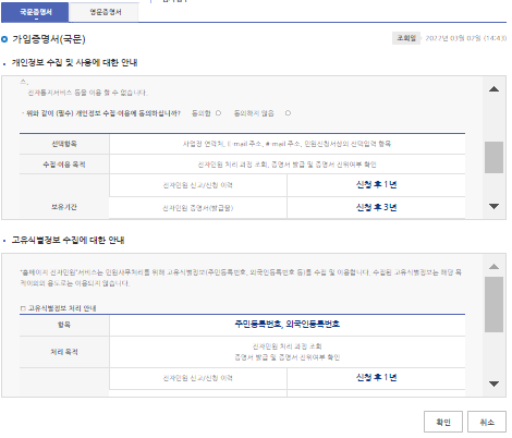 하기와 같은 화면이 나오게 됩니다. 여기서 가입증명서(국/영문)
