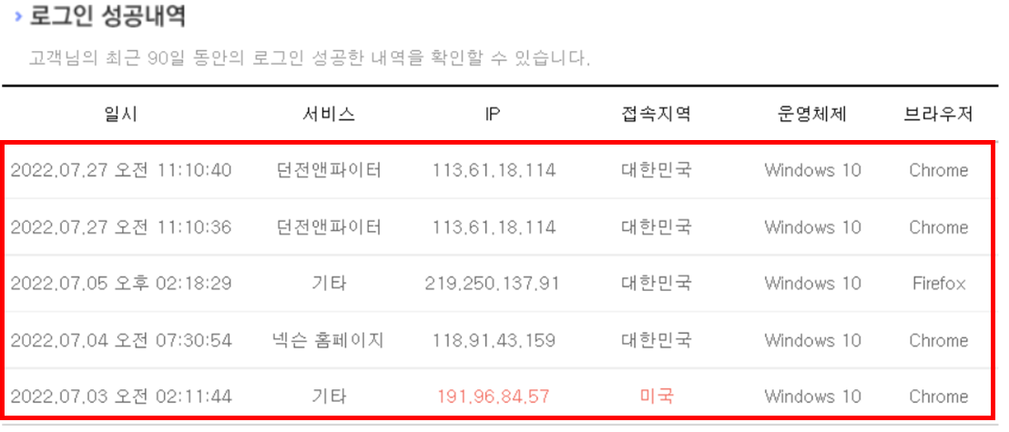 접속지역이 대한민국에도 존재했으니 해외 로그인 차단만으로는 부족하다.