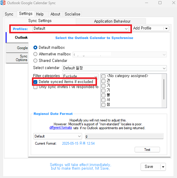 동기화할 날짜와 범위/정기적 동기화, 아웃룩 이벤트 발생 시 동기화일지 등.. 설정이 필요하다.