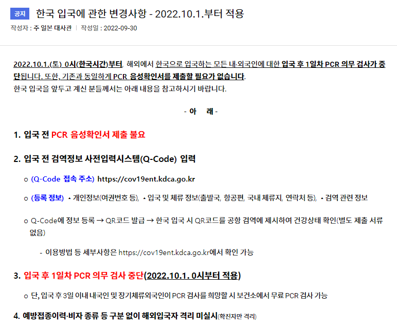 | 2022.9.3.부터 한국 입국시 PCR 검사 면제 (0) | 2022.09.03 |