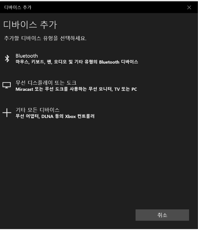 장치 추가를 눌러보면 검은색 창이 나온다.