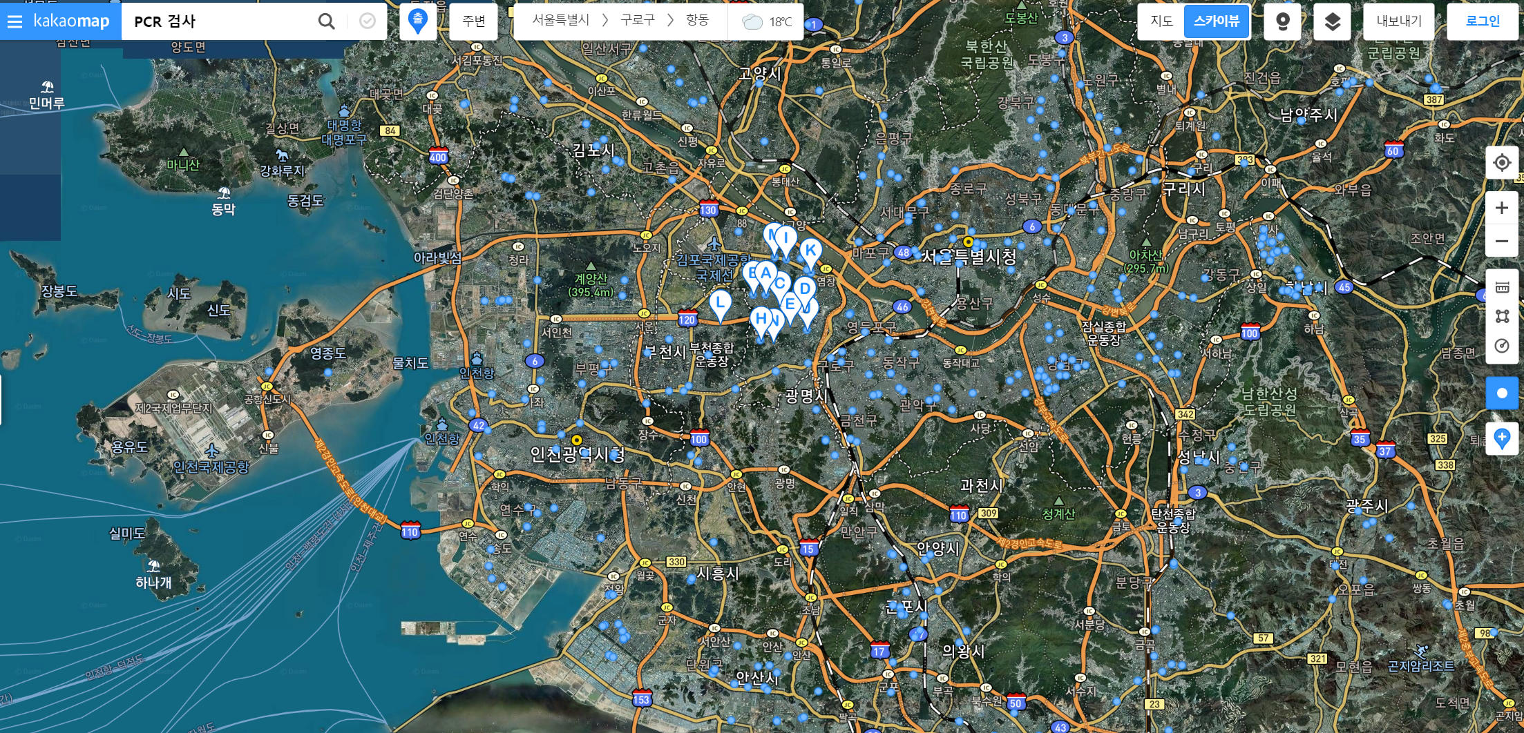 다음 지도(카카오 지도)에서 검색했을 때 무수한 점들이 PCR검사가능한 곳
