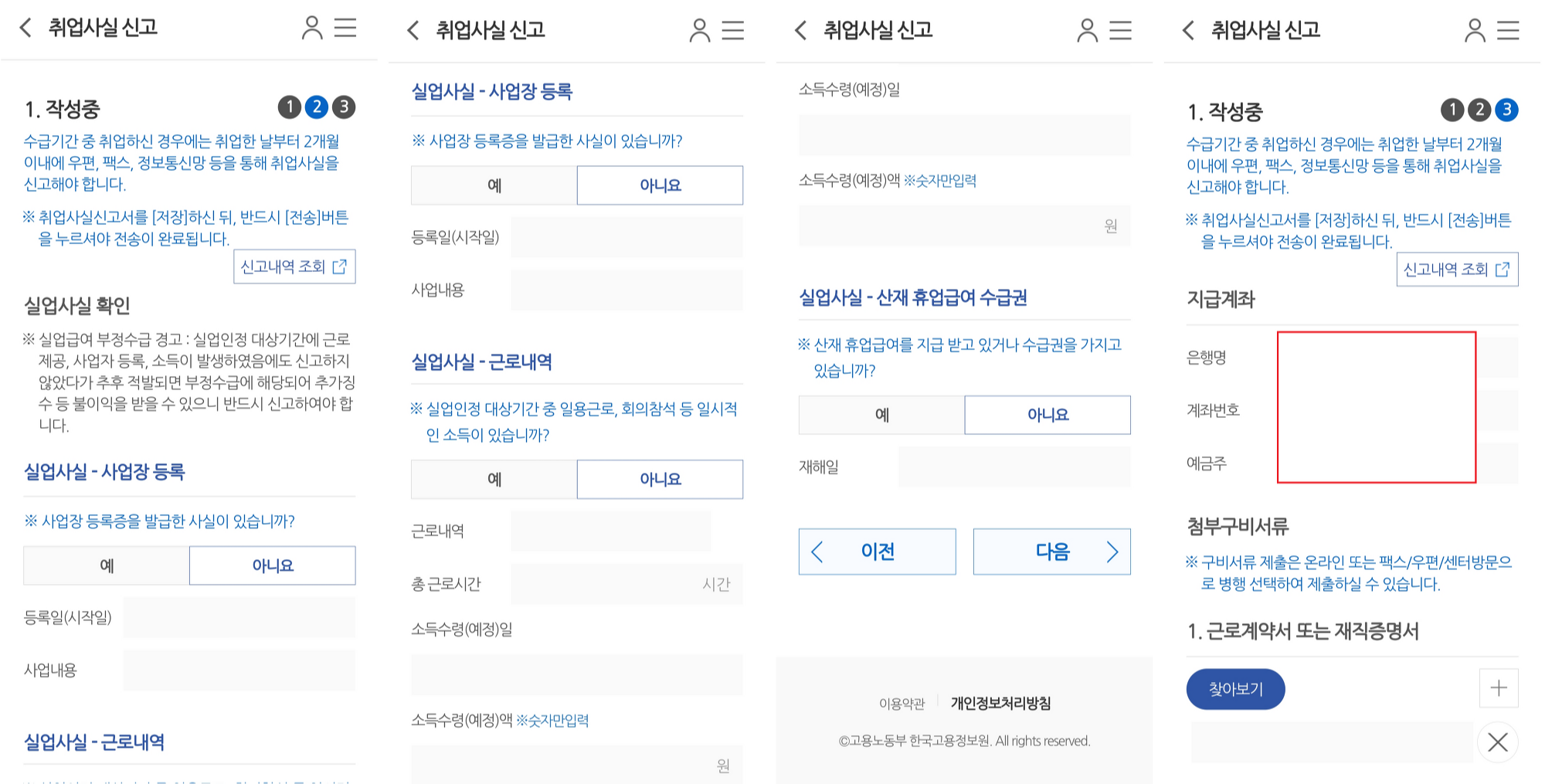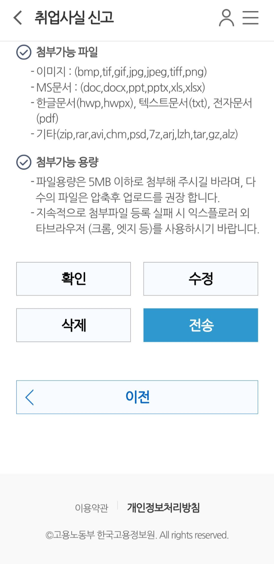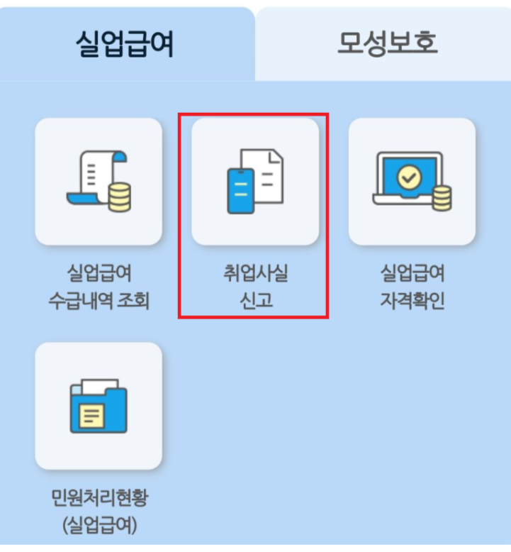 첫화면에서는 취업사실 신고 화면이 나오지 않는다.