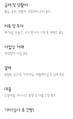 거래 목적에는 여러가지 항목이 있지만 자유롭게 사용한다는 명목이라면 "급여 및 생활비"나 "저축 및 투자" 이정도가 나을 것 같다.
