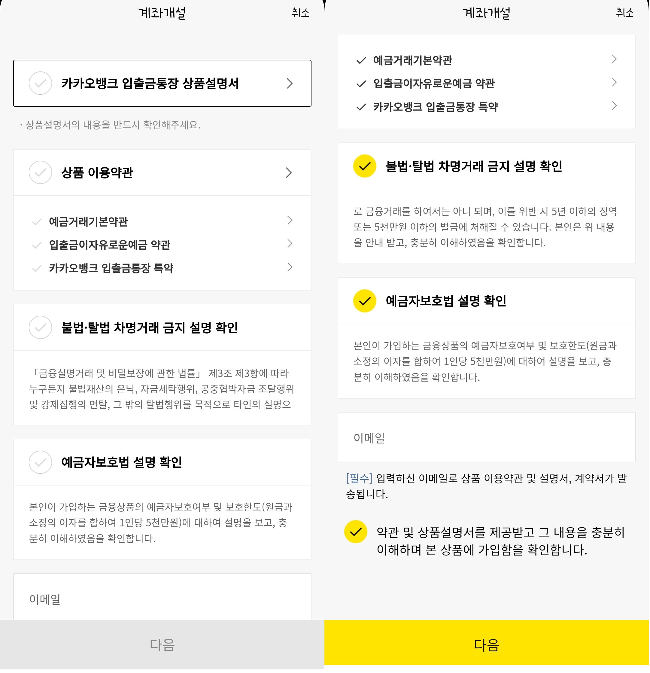 그리고 상품설명서와 약관 확인, 이메일 주소 등을 입력합니다