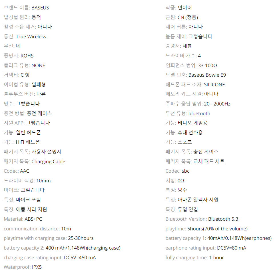 Baseus Bowie E9 True Wireless 이어폰 사용 설명서
